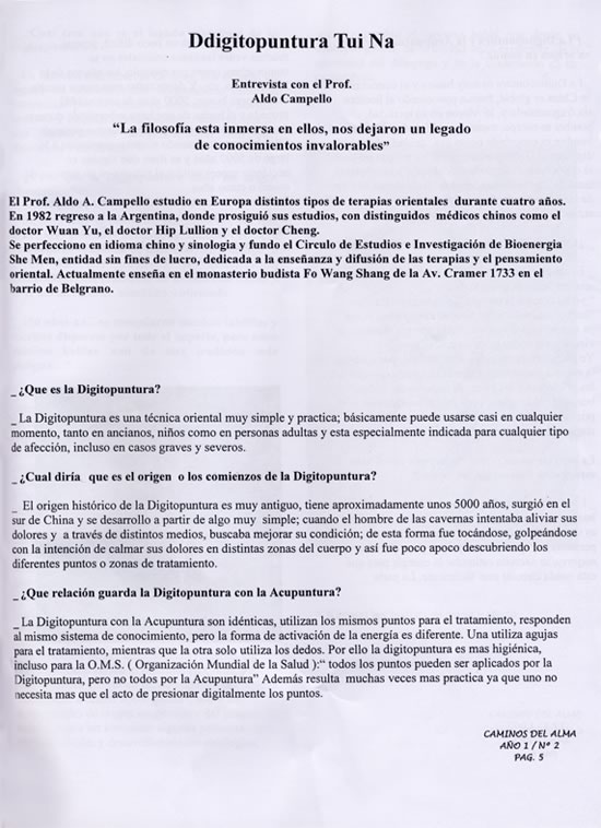 En el año 2013 El profesor Aldo Augusto Campello fue entrevistado por Mariela Poggi en Radio Ahijuna F. M. 94. 7 mhz en el programa “ Con el Caballo Cansado”, donde expuso algunos conocimientos de digitopuntura y los cursos que se están dando en el Complejo cultural Mariano Moreno de la ciudad de Bernal.